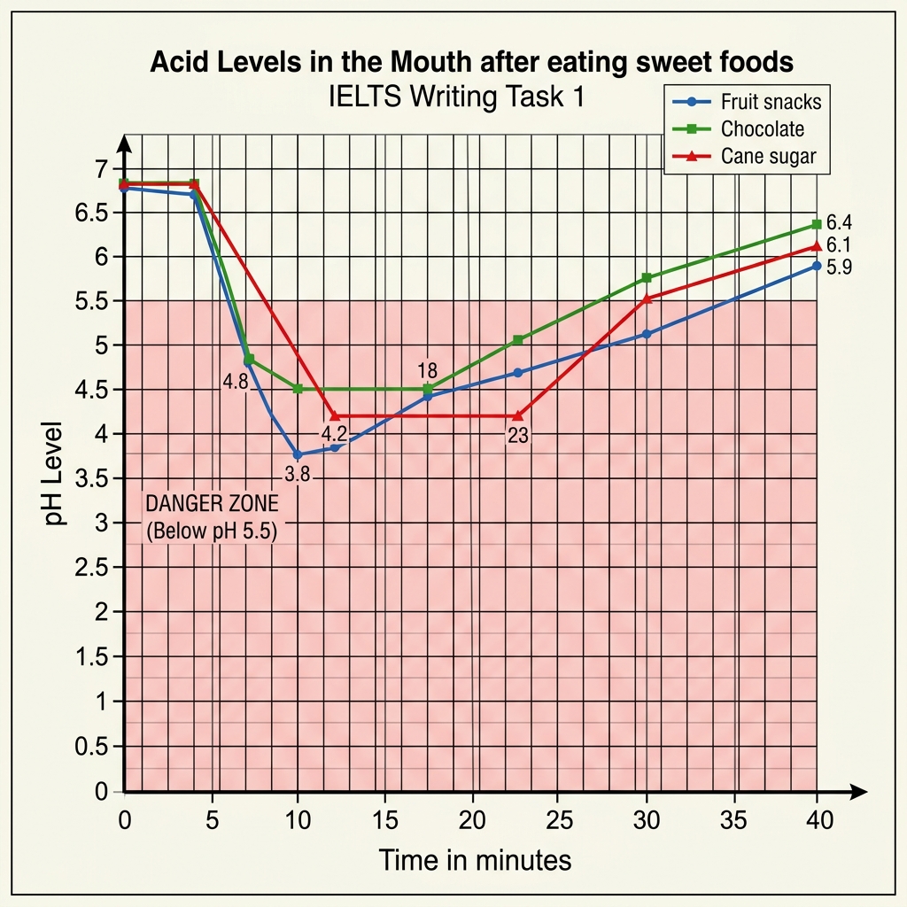 The line graph below shows the acid levels in the mouth after eating sweet foods, which can cause tooth decay....