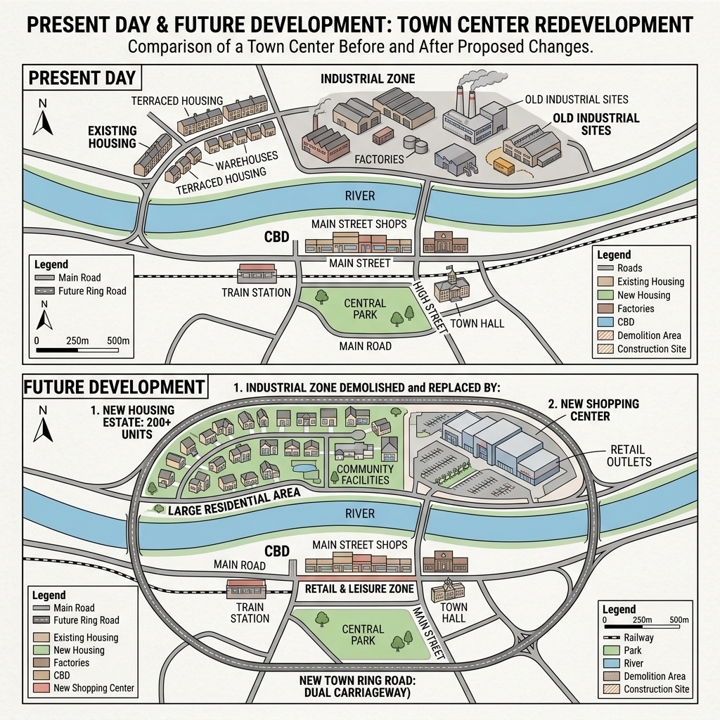 The maps below show a town center as it is now and plans for its development in the future.